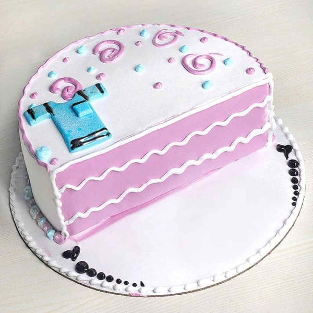 Designed in a unique half-cake style, this creation features soft pastel colors, cute piping details, and a fondant baby boy T-shirt topper that adds the perfect charm.